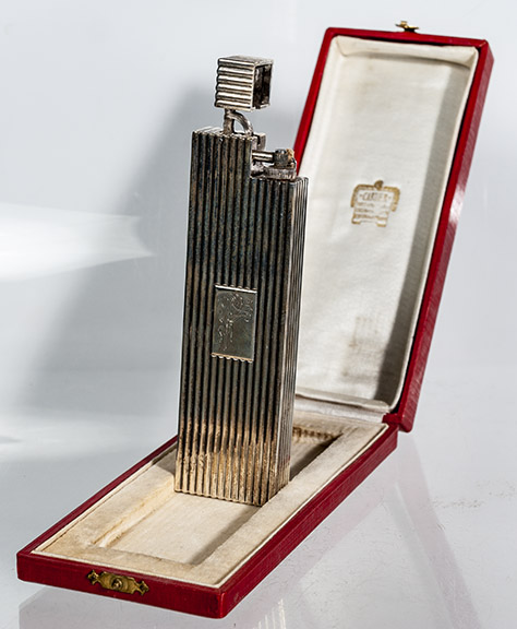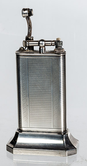 | Cartier petrol desk lighter in original box ca.1939 - item #22-104, $3,000.00 | Dunhill lift-arm table lighter ca.1929. Beautiful engine turning- item #22-105, $350.00 |