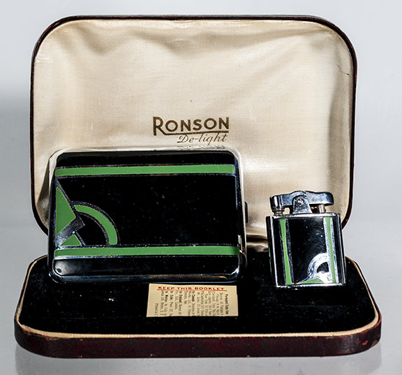 | Ronson Set, green and black lacquer, Excellent, in working condition, and in its original box. - #22-106, $350.00 | Famous NYC “21 Club” table lighter 1950’s - item #22-107, $375.00 |