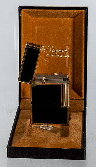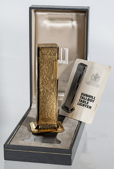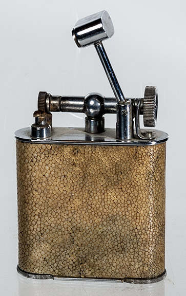 | Dunhill butane Tallboy table lighter in box, 1970s- Item #22-118, $275.00 | British “Classic” lighter. Shagreen covering, 1920s, petrol- Item #22-119, $325.00 |