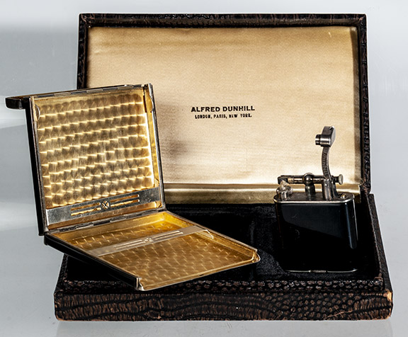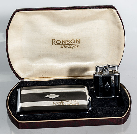 | Dunhill Black enamel set in original box Lighter and cigarette case – silver plate, 1920s- Item #22-120, $1,500.00 | Ronson art deco set. Lighter and cigarette case in original case, 1930’s- Item #22-121, $275.00 |