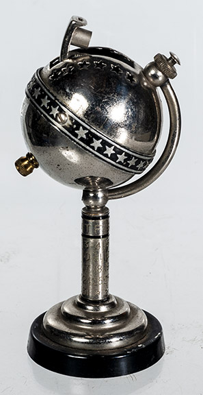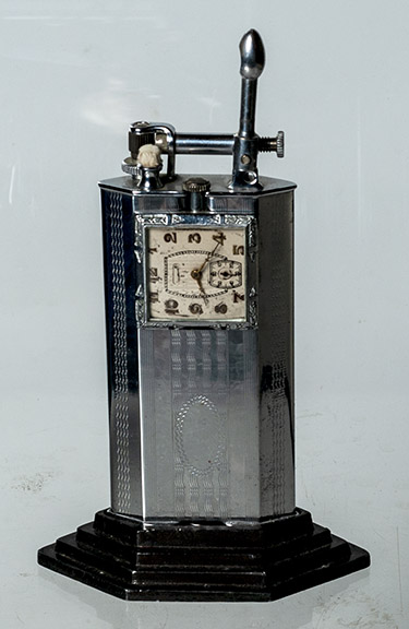 | Occupied Japan globe lighter with perpetual calendar- Item #22-124, $225.00 | Triangle 1920’s table lighter with clock- Item #22-125, $275.00 |