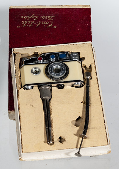 | Parker lift-arm table lighter- Beautiful engine turning with original lifter piece still intact- Item #22-127, $375.00 | Occupied Japan camera shaped lighter. Unusual cream color. Comes with original tripod and shutter release to light- Item #22-128, $250.00 |
